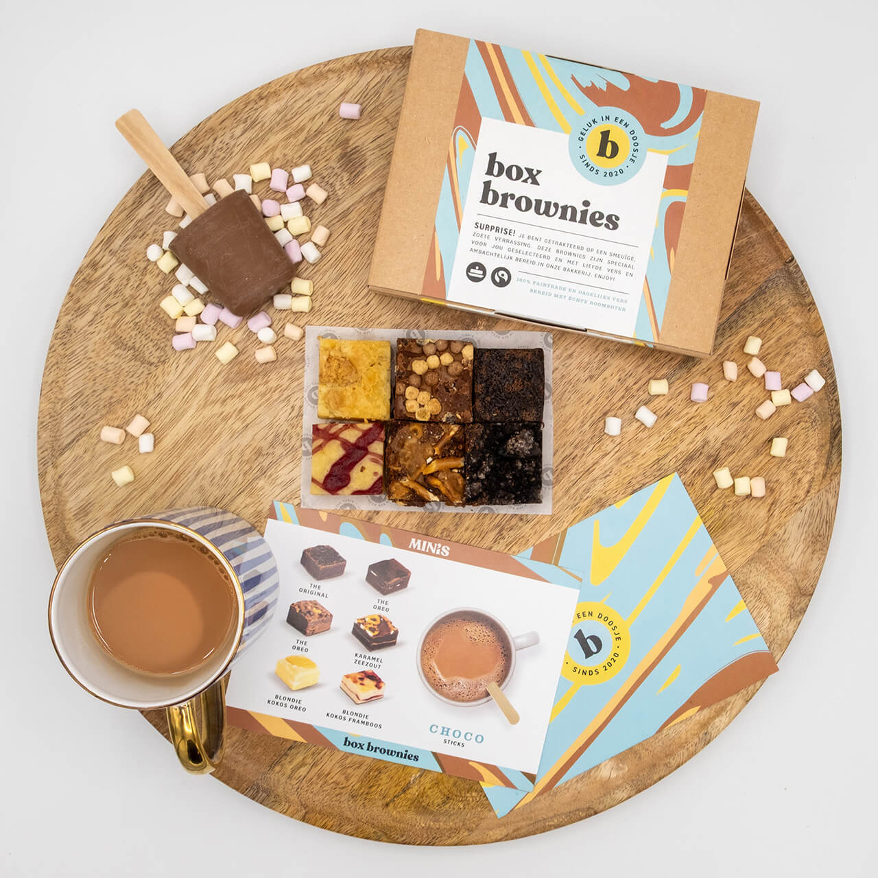 Bij de levering geven wij in de verpakking het advies mee om de brownies eerst in de koelkast te bewaren voor stevige brownies en op kamertemperatuur voor zachte brownies.