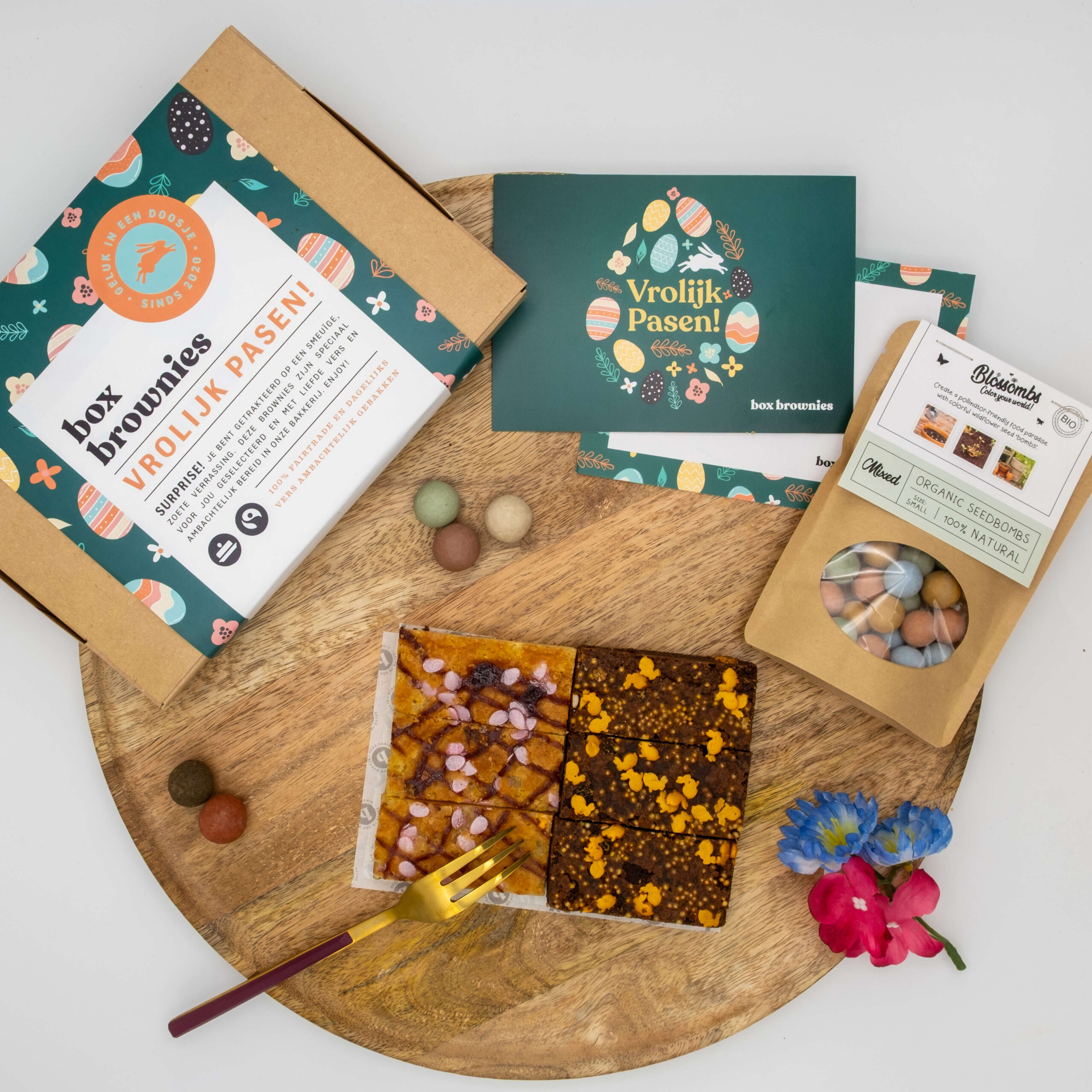 Deze box is gevuld met 6 heerlijke bars in de smaken: Paas Sprinkles Brownie (3 bars) met knapperige bloemen sprinkles en Framboos Blondie (3 bars) met paasei sprinkles. Daarnaast bevat de box 25 Blossombs zaadbommetjes. Blossombs zijn biologische, kleurrijke bommetjes vol bloemenzaad voor bijen en vlinders. Leg de Blossombs buiten in de tuin, op een braakliggend stukje grond of in een pot op je balkon (vermijd natuurgebieden). Met een beetje water en geduld geniet de ontvanger later van de meest kleurrijke bloemen!